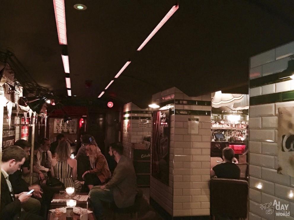 Cahoots : Métro, boulot, dodo… et encore métro ! Bienvenue chez Cahoots, le seul resto qui vous fait manger dans une vieille bouche de métro. Décor décalé, néon au plafond, faïence blanche, escalier vertical, lecture dans les toilettes, tickets… il ne manque rien. Juste un petit détail, mieux vaut réserver à l’avance sinon tu fais la queue pendant 1h30… comme nous. Pour trouver le lieu aussi ce n’est pas évident donc garder de la batterie et demander… c’est le mieux !