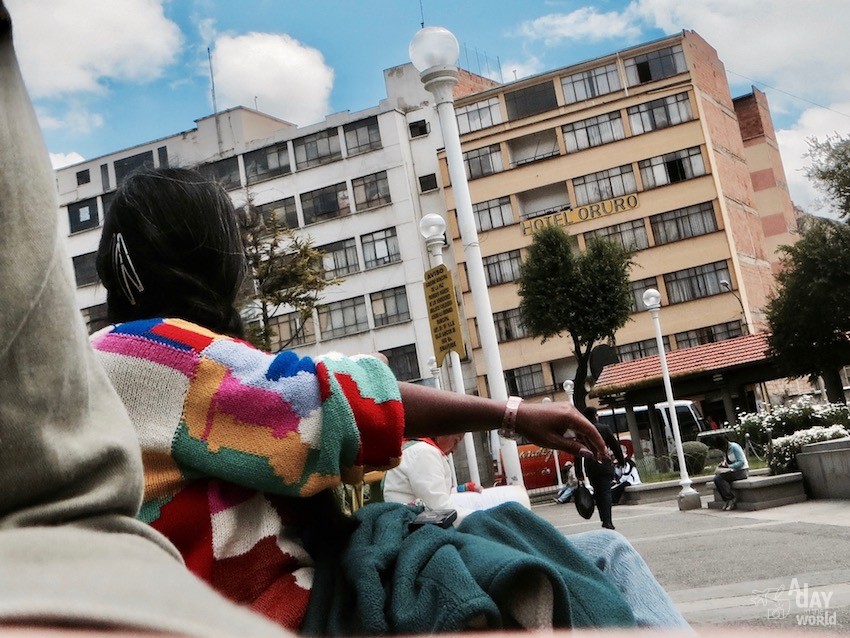 Je décide de m’asseoir sur le muret pour bouquiner mon guide et me faire un petit plan des coins à visiter dans la journée. Le soleil tape (chose plutôt rare à La Paz), après les violentes pluies de la veille. Quelques minutes plus tard, je relève la tête, demande au monsieur à ma droite le nom de la place, « Plaza Mendoza ». A ma gauche une femme. De longs cheveux noirs tressés avec une grosse frange, des barrettes rouillées glissées dans sa chevelure entre deux clips à strass rouges, un pull tricoté multicolore un peu défraichi, un jean, des basquets sombres et troués, un mascara bleu à la Liliane et des ongles de 5 cm oranges à strass (oui je m’incline sur ce coup). Son portable à la main, elle diffuse dans son petit périmètre une musique entraînante et joyeuse entre deux grésillements. Peut être de la Cumbia ? Musique spécifique à la région dont m’a parlé mon taxiteur de la veille.
