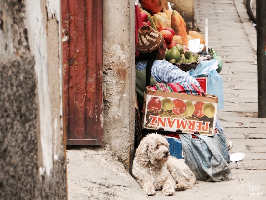 Après un arrivée mouvementée de l’aéroport d’El Alto avec mon taxi qui me fait descendre la route à toutes berzingues. Tout vibre, tous les voyants sont éclairés sur le compteur, une dizaine de sapins parfumés à la vanille avec le drapeau américain qui swinguent de droite à gauche. On roule sur un chien déjà écrasé, pas le temps de l’éviter… Il faut foncer, on double à droite, à gauche, on frôle de justesse les joggers du matin qui se fondent dans les frises multicolores qui ornent les murets du bas côté. Bienvenue à La Paz, capitale administrative de la Bolivie qui n’est autre que la capitale la plus haute du monde avec ses 3660 m d’altitude.